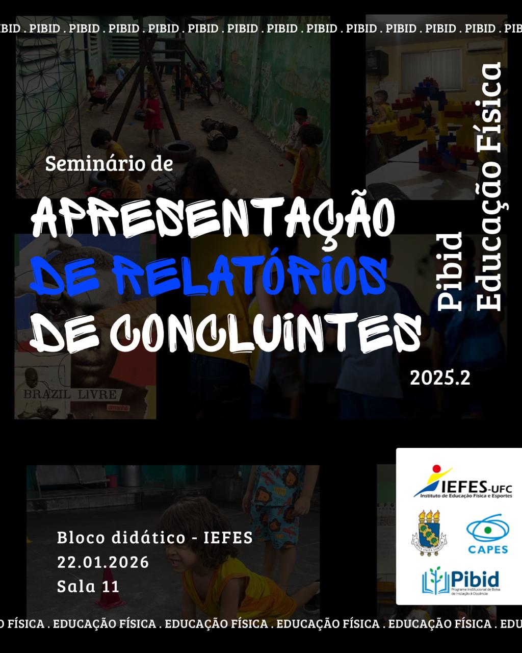 • Apresentação dos Relatórios dos/das/des bolsistas concluintes 2025.2Data: Quinta-feira, 22 de janeiro Horário: 9h às 12h Local: Sala 11 Momento de socialização dos resultados e reflexões sobre as experiências formativas vividas no programa.