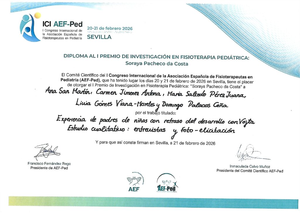 Esse prêmio busca impulsionar a investigação aplicada, a transferência de conhecimento e a inovação clínica no âmbito da fisioterapia pediátrica. Em sua estância de pós-doutorado na URJC, a professora Livia Viana, contribuiu na pesquisa da doutoranda Ana San Martín Gomez, primeira autora do artigo, e por isso fez parte desse artigo, o que demonstra a importância do trabalho interdisciplinar, já que a profa. Livia Viana é da área de psicologia do desenvolvimento.